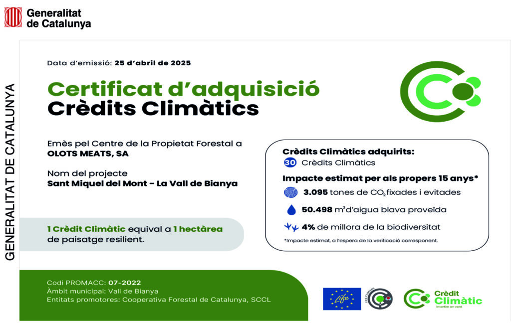 El Centro de la Propiedad Forestal (CPF), adscrito al Departamento de Agricultura, Ganadería, Pesca y Alimentación de la Generalidad de Cataluña, acaba de entregar a Olot Meats, S.A., el certificado de adquisición de Créditos Climáticos, una vez terminados los trabajos del Proyecto de Mitigación y Adaptación al Cambio Climático ( Por estos trabajos, ejecutados en dos fases por la Cooperativa Forestal de Cataluña, con el apoyo del Consorcio Forestal de Cataluña, durante los últimos dos años, Olot Meats ha obtenido un total de 30 Créditos Climáticos, uno por cada hectárea intervenida de paisaje resiliente. El certificado acredita que la acción promovida y financiada por Olot Meats se ha adecuado a los objetivos inicialmente previstos, y que ha contribuido a la fijación de más de 3.000 toneladas de CO₂, a la obtención de más de 50.000 m3 de agua azul ya la mejora de la capacidad de acoger biodiversidad.